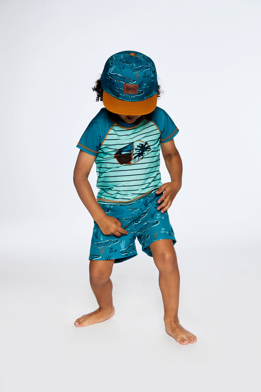 chandail maillot de bain à manches courtes bleu marine, turquoise et orange