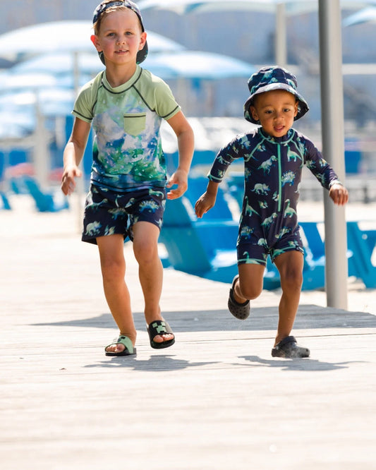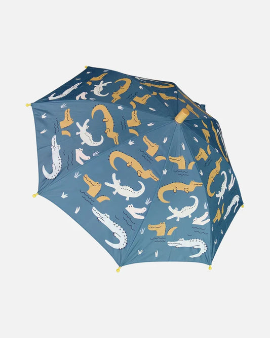 Imperméable bleu avec crocodiles qui changent de couleur au contact de l'eau
