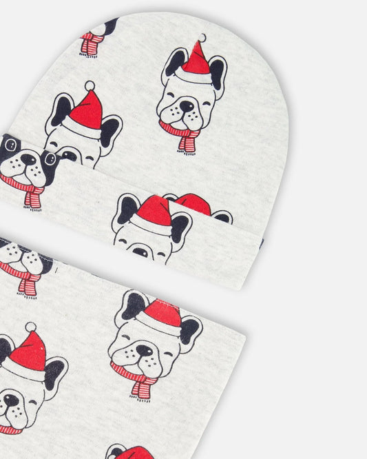 Ensemble bavoir et bonnet beige chiné imprimé chiens