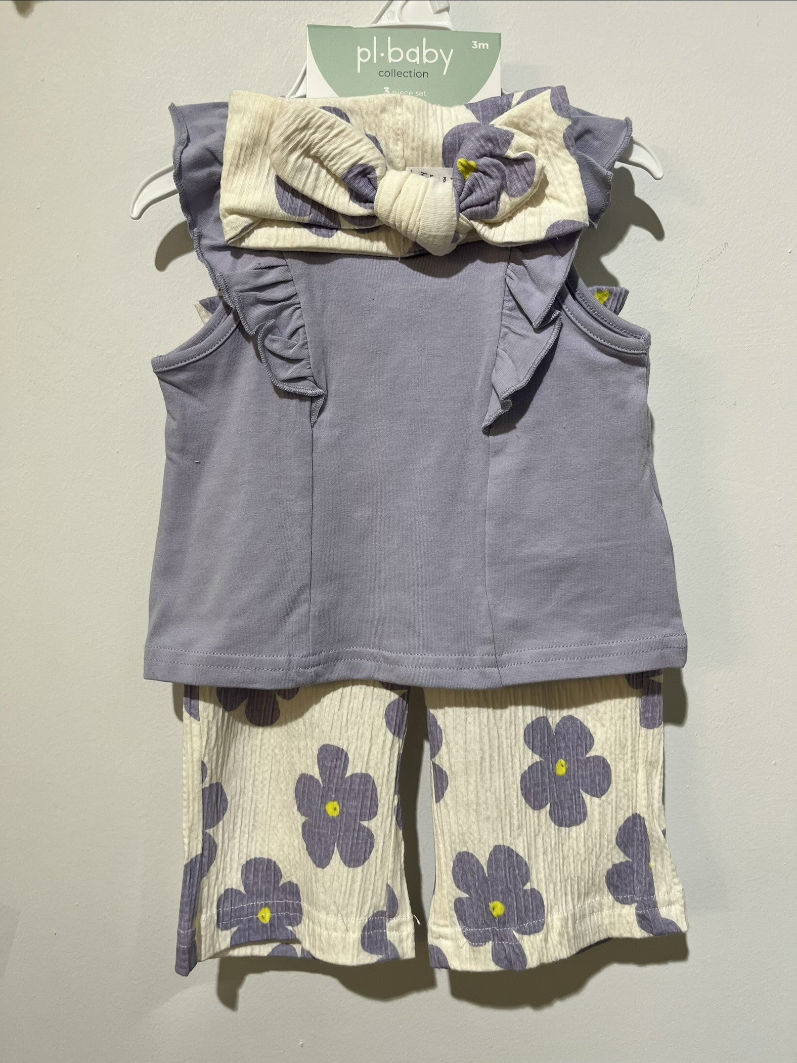 Cet ensemble pour bébé de couleur lilas, composé de trois pièces, est parfait pour les journées ensoleillées. Il comprend une camisole à volants, un short à motif floral et un bandeau assorti.